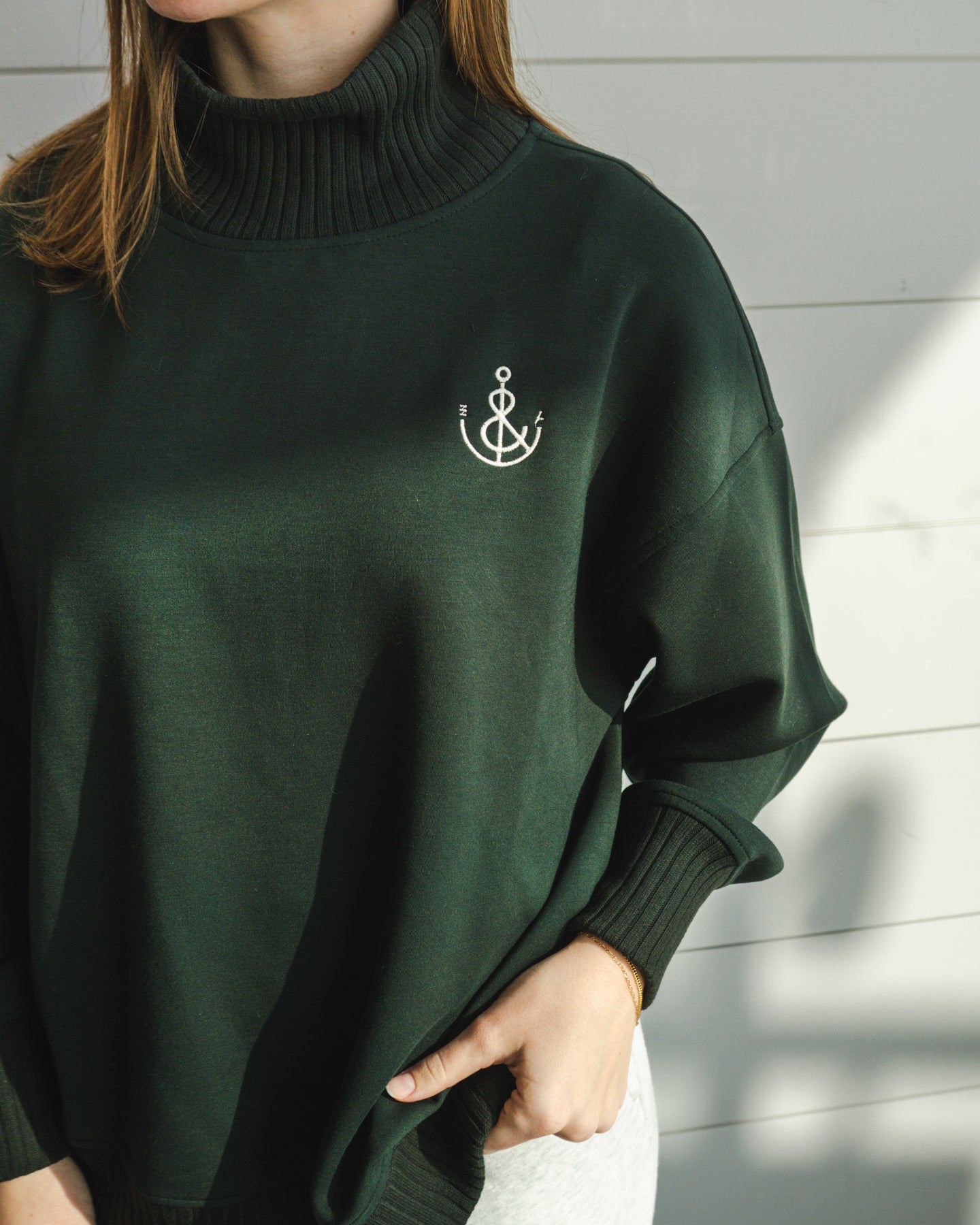 New! We are excited to launch these women’s scuba mockneck crews. This simple design features our anchor embroidered in white and a drop shoulder sleeve. These pullovers are a super soft addition to any wardrobe! With a cuffed edge, they can be worn with leggings, a front tuck with jeans or layer over your favorite dress or skirt. Perfect work from home apparel or head to the beach wear.